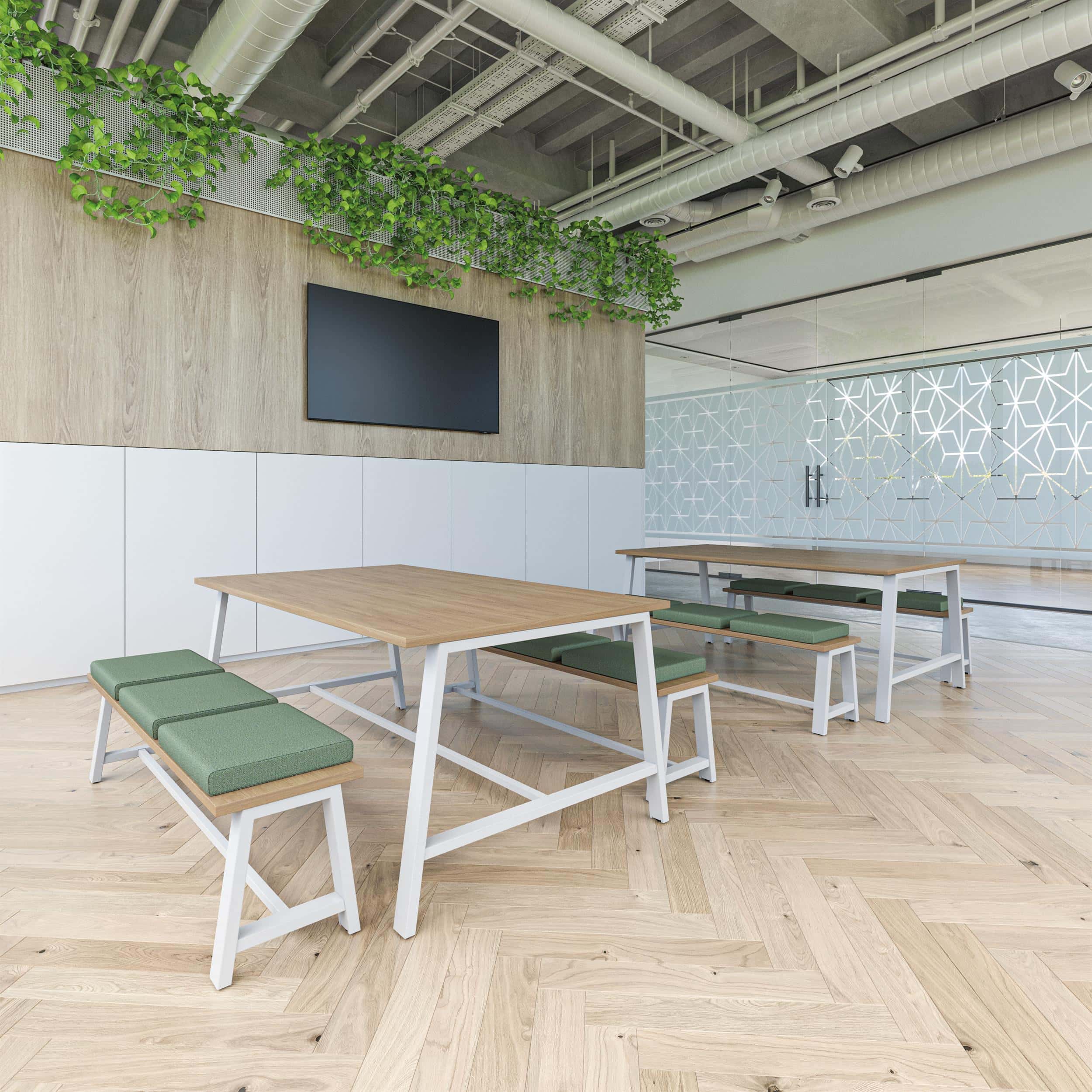 Matching bench seats are available to complement the tables, with optional upholstered seat pads in a choice of fabrics. Frames are offered in three standard finishes — Black, White and Silver — alongside eight Impact colour options for a more distinctive look. An optional overframe accessory adds further flexibility, supporting additions such as lighting, shelving and planter elements.