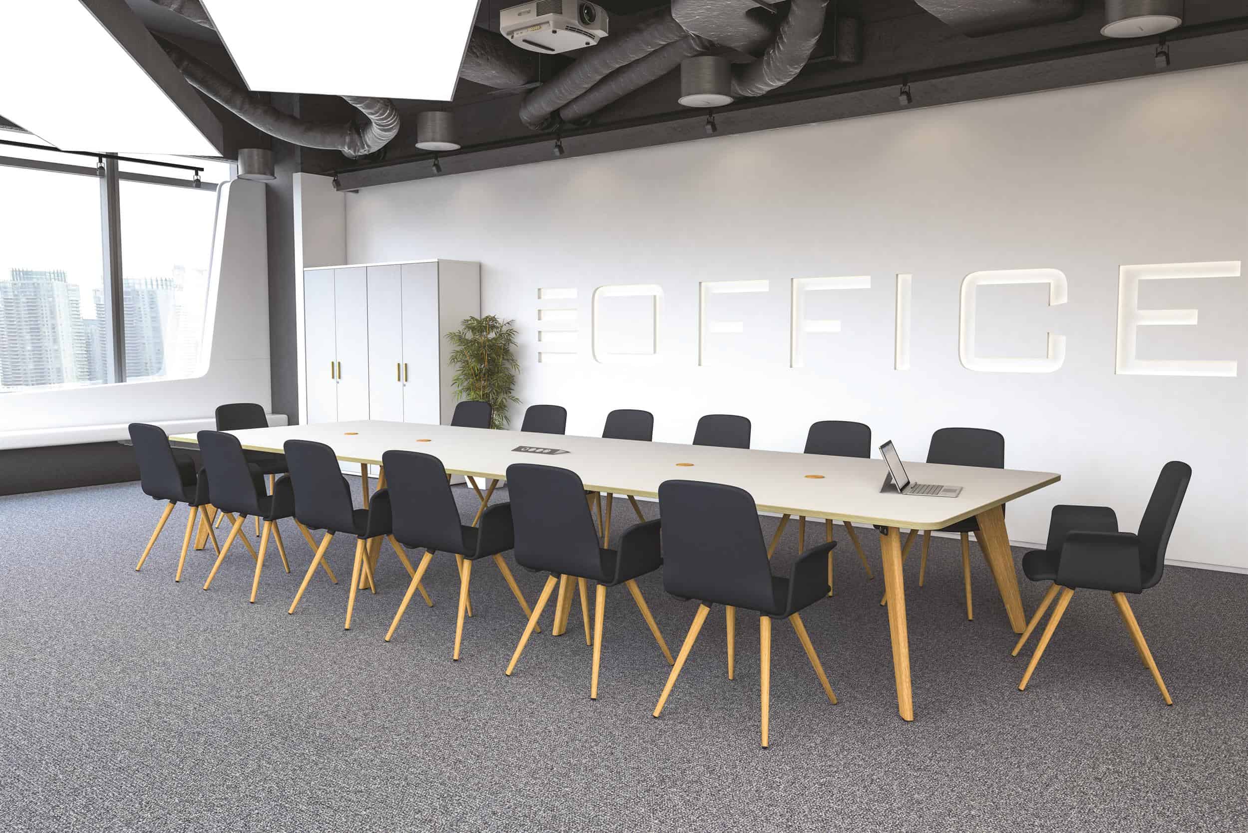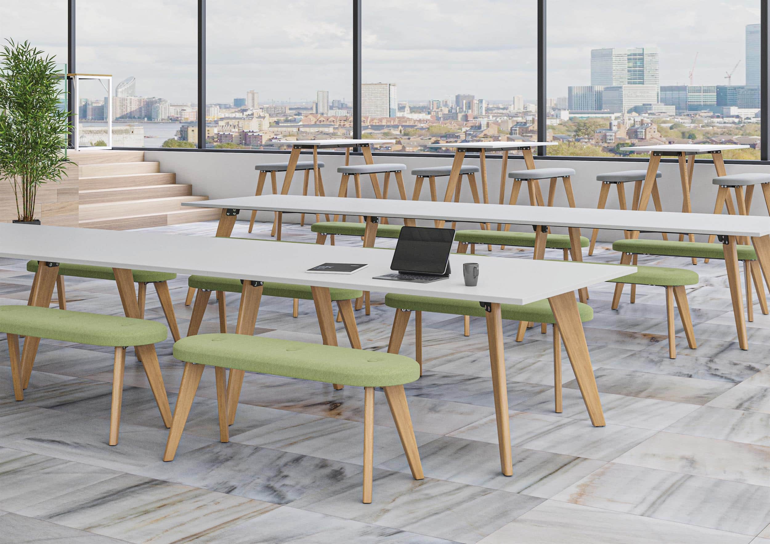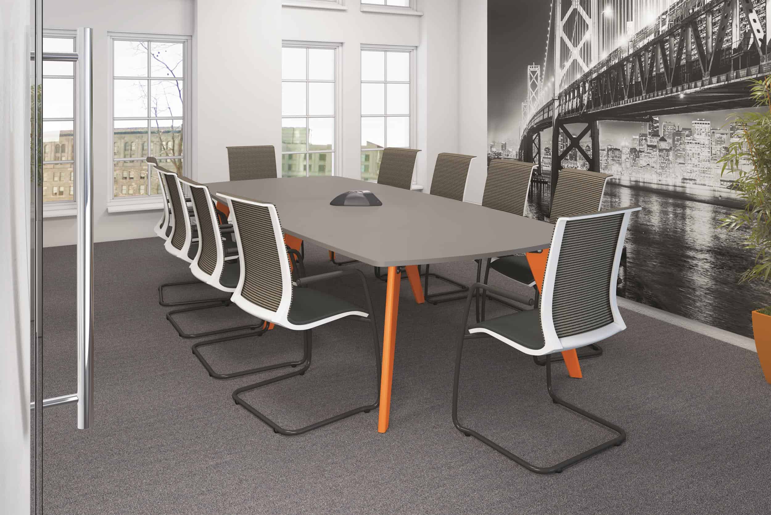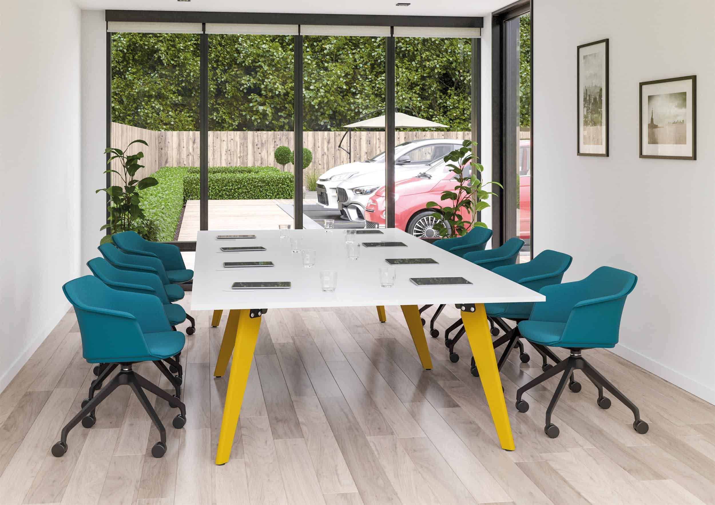 Evolve is a comprehensive boardroom and breakout table range that pairs natural Oak or RAL painted legs with a broad choice of top shapes, sizes and finishes. The leg options span a wide palette of colours, making it straightforward to create combinations that work with virtually any office interior scheme.
