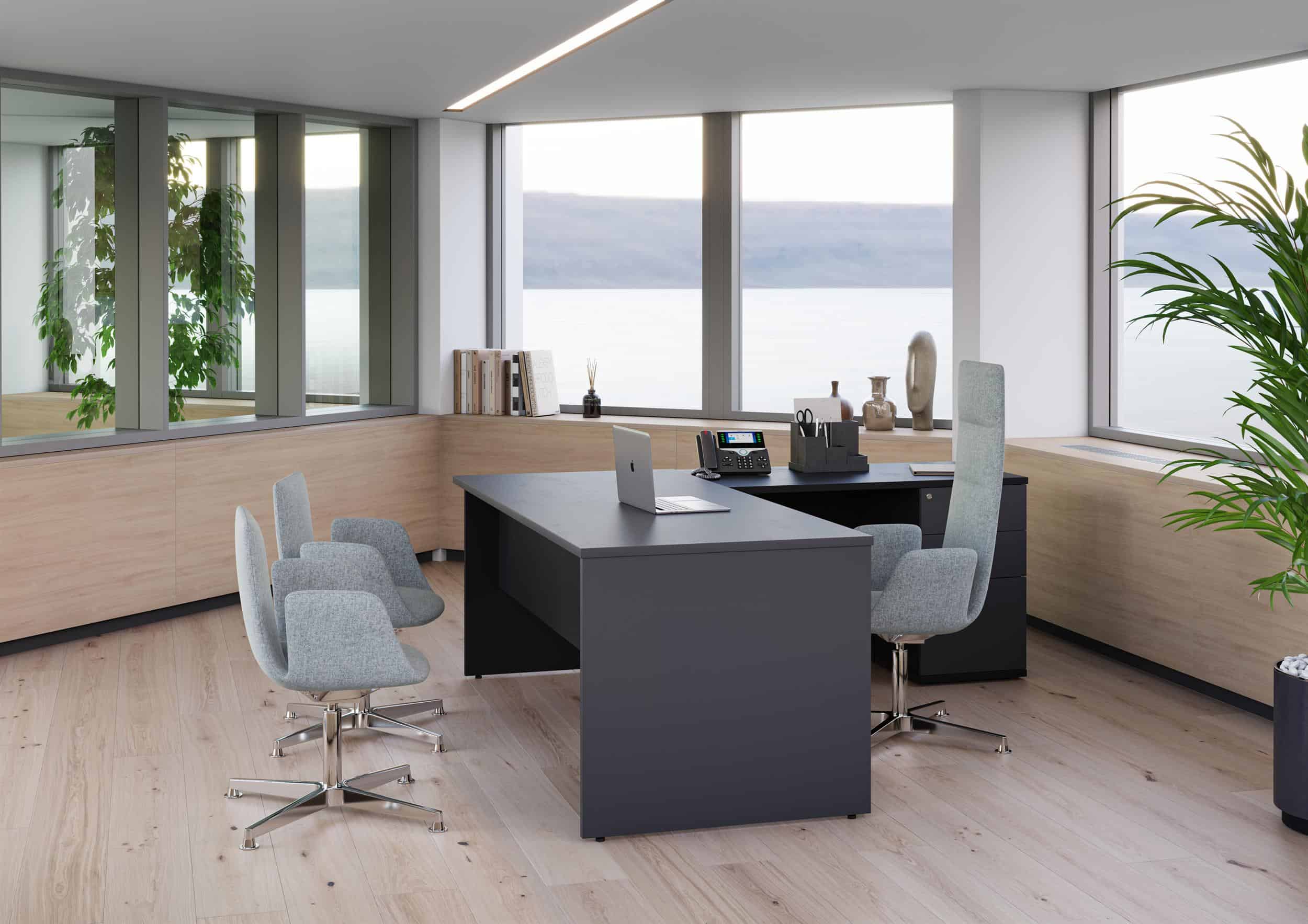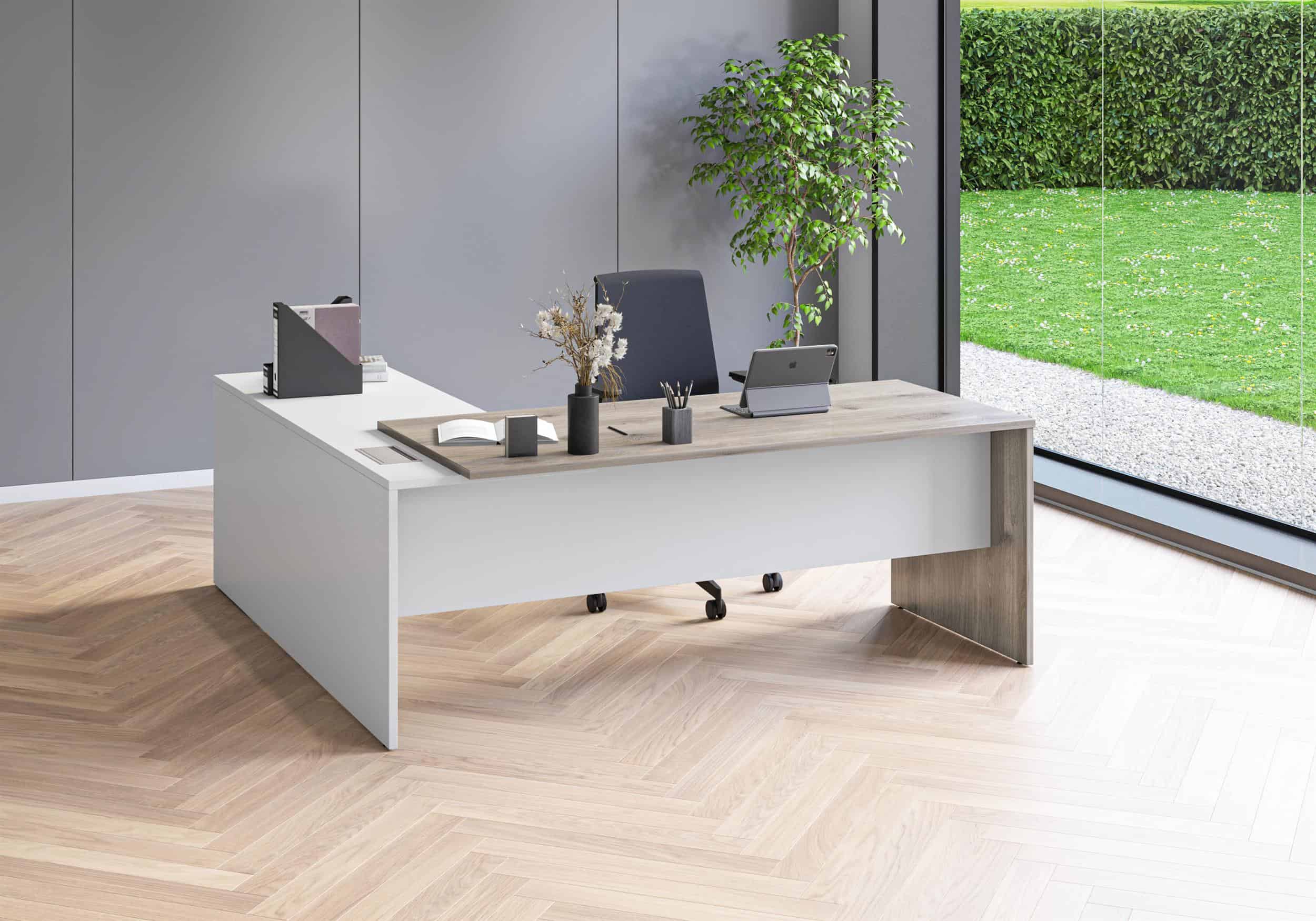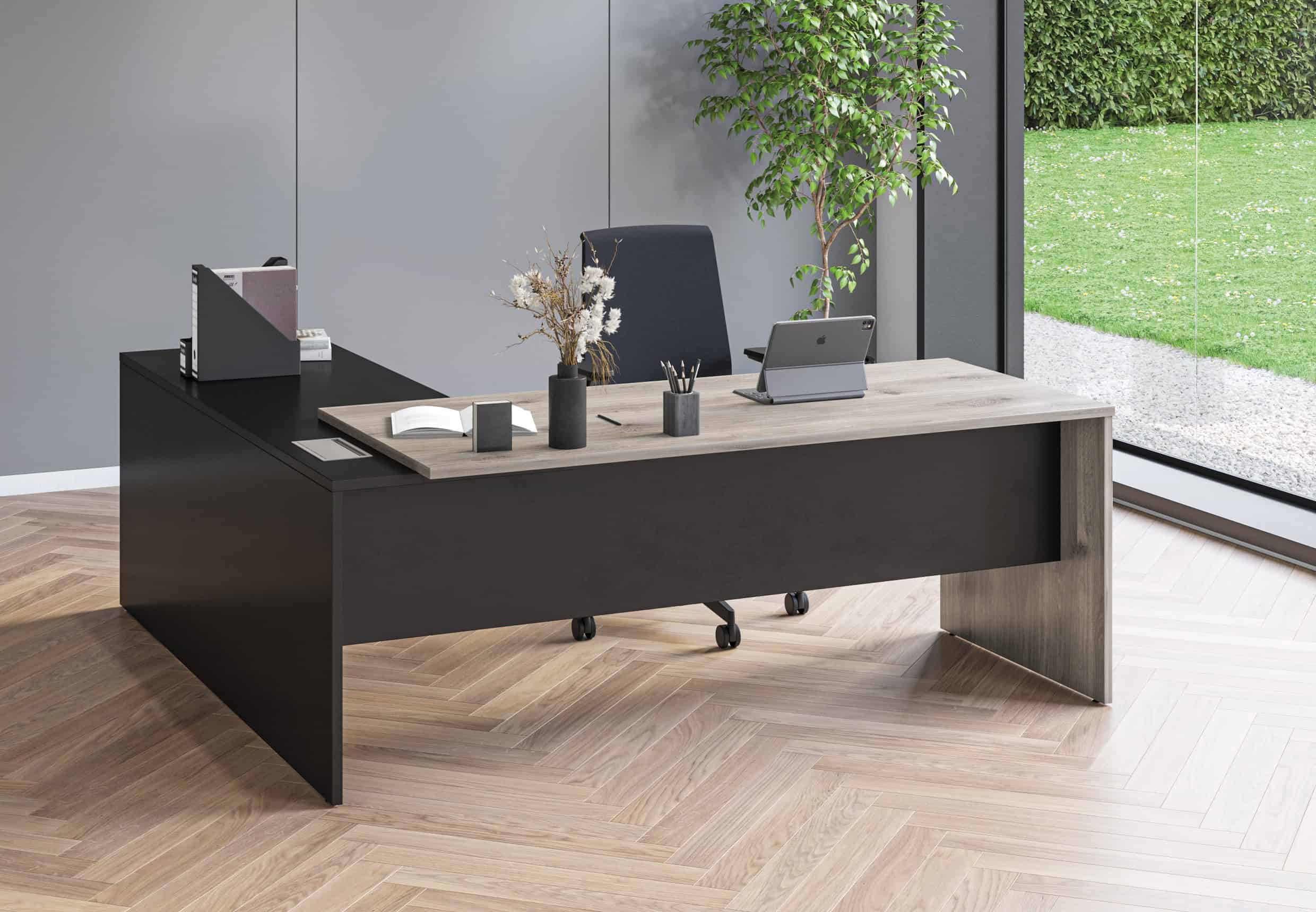 The Executive range of managerial desks combines a professional aesthetic with practical functionality, offering both rectangular and corner configurations to suit a variety of office layouts. The corner version includes a built-in three drawer pedestal, providing convenient storage within the workspace.